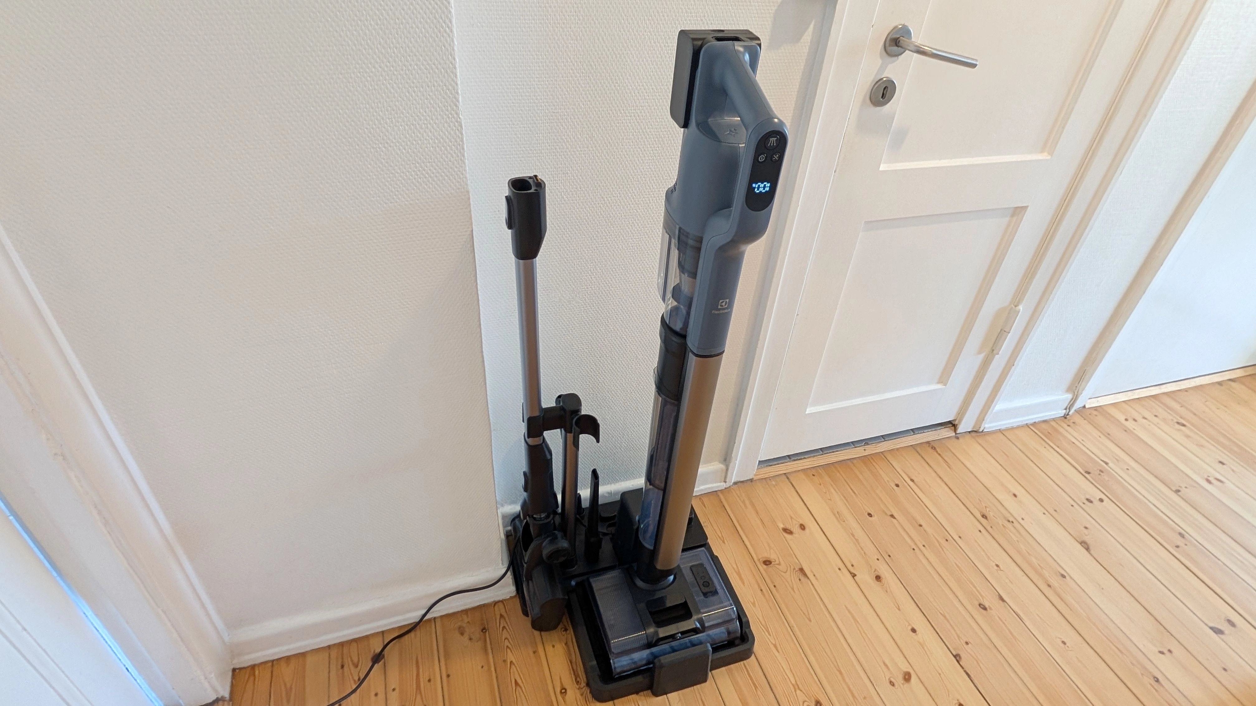 Det er smart, at Electrolux 800 3-in-1 Wet&Dry kan bruges til tre forskellige opgaver. Den kan støvsuge, vaske gulv og fungere som håndholdt støvsuger. Den understøtter automatisk sugestyrkeregulering og har også en turbo-tilstand, der kan aktiveres med et tryk på en knap. I Auto-tilstand registrerer sensorer snavs og tilpasser sugestyrken, mens man selv skal aktivere turbo-tilstanden. Det vises med farvekoder på støvsugerens display. Når gulvet er vasket, og støvsugeren er tilbage i ladestanderen, så kan man aktivere en automatisk moppevask- og tørrefunktion. Så fylder maskinen sæbevand i bakken på ladestanderen og vasker moppe-rullerne. Det er en smart funktion. Efter vask kører maskinen så en tørrecyklus på tre timer, hvor den varmer og tørrer mopperullerne. Det er praktisk, men udsender også en summende lyd, som godt kan blive irriterende.