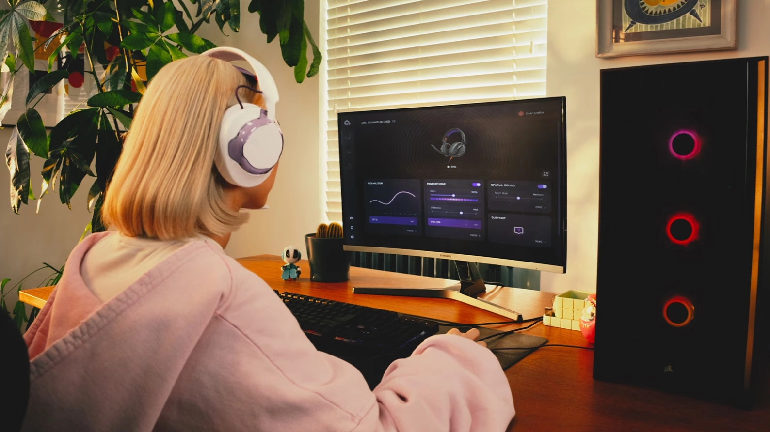Gracias al software JBL Quantum ENGINE, el usuario puede personalizar su perfil de sonido, acceder a un visualizador en tiempo real para identificar fuentes sonoras, reducir ruidos externos y optimizar su rendimiento en juegos competitivos o cooperativos. Además, cuenta con sonido espacial Quantum, que aplica procesamiento inteligente para lograr una percepción tridimensional más realista y precisa.