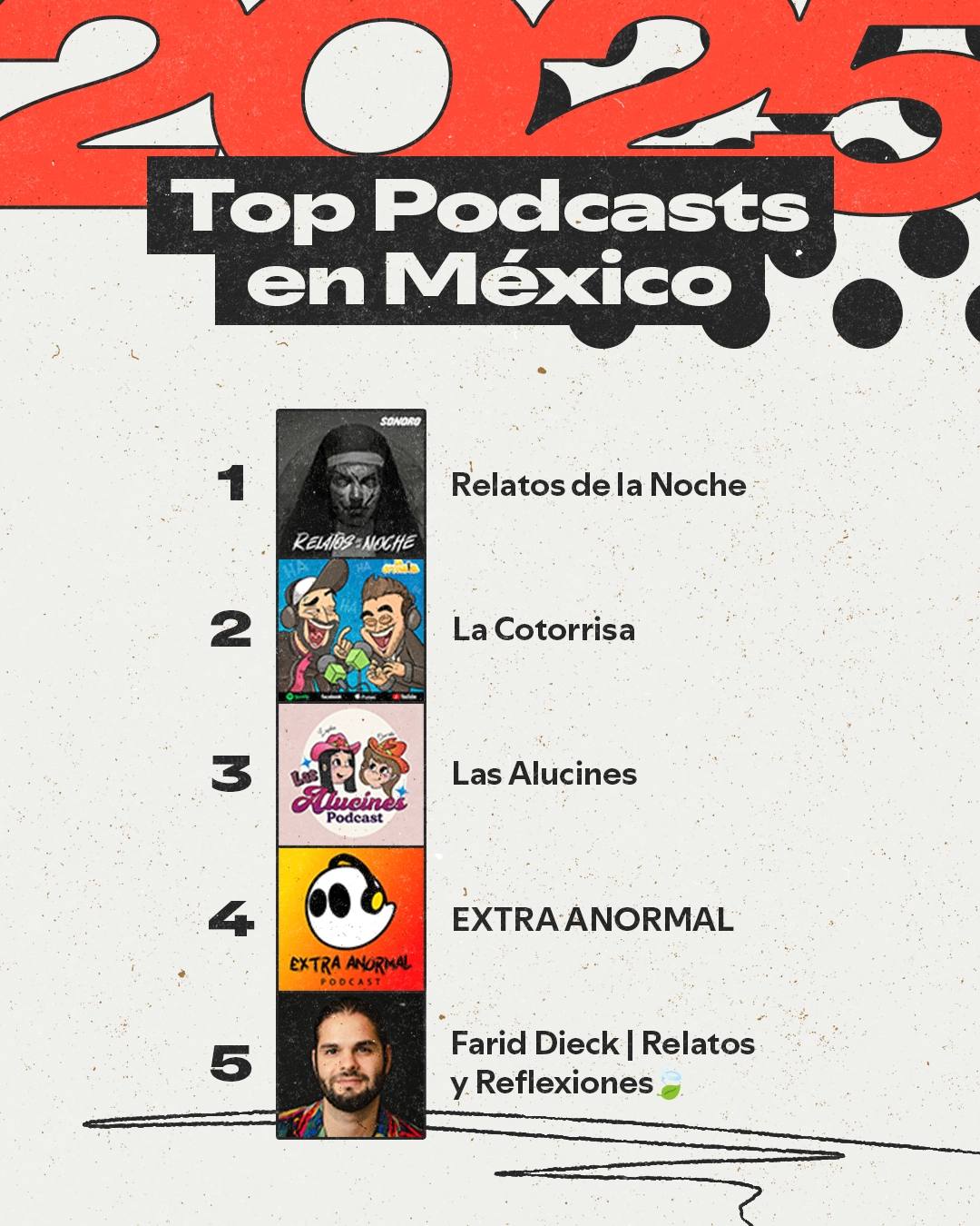 Por tercer año consecutivo, Relatos de la Noche se mantiene como el podcast más escuchado de México. Y no solo eso: sigue siendo el podcast en español más escuchado del mundo, reafirmando el poder global de las historias hechas desde México para el mundo.