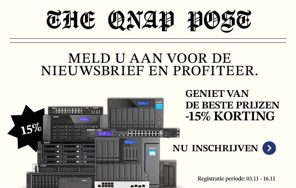 Schrijf je in en geef aan welke modellen je wilt — ontvang een exclusieve kortingscode van 15%. Registreer vóór 16 november 2025 en verzeker je van de beste prijs op geselecteerde NAS-systemen, switches, routers en uitbreidingsunits. Wees als eerste op de hoogte van nieuwe releases, bundelaanbiedingen en seizoensacties.