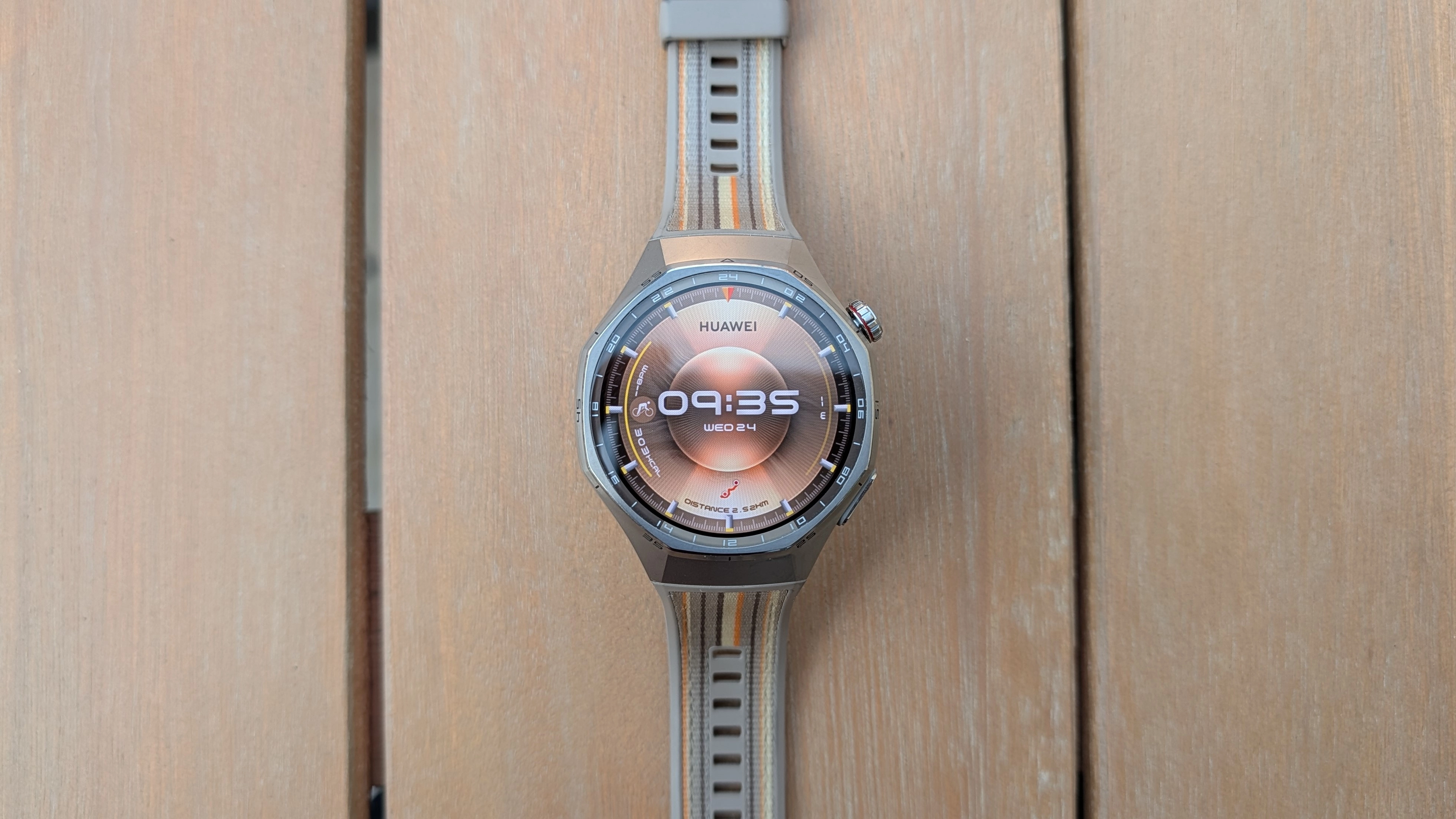 Met 46mm is de GT6 Pro beslist groot, maar door het relatief lage gewicht van 53 gram en de afgeronde hoeken zit het comfortabel om de pols. Ook tijdens intensieve workouts, zoals hardlopen, schuurt of klemt het horloge niet. Er zijn verschillende bandjes beschikbaar, maar ik heb deze keer gekozen voor het jaren 70-geïnspireerde design stoffen bandje. Het is niet een bandje dat ik normaal zou kiezen, maar ik was het traditionele zwarte bandje een beetje beu. Resultaat: ik vind hem helemaal top. Deze kleur zal echt niet bij iedereen in de smaak vallen, maar in combinatie met het grote formaat van het horloge komt deze kleur goed tot zijn recht.