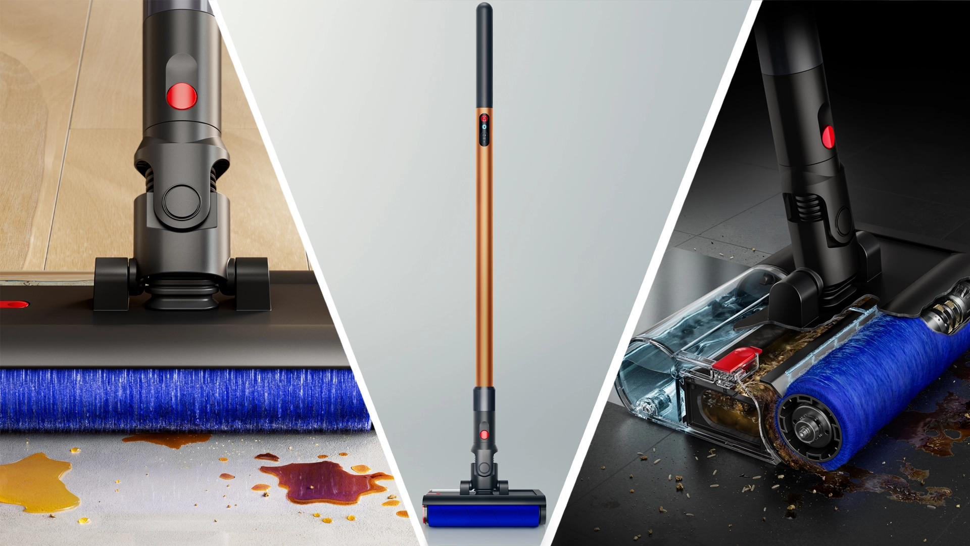 Over naar de vloerkop. Die bevat twee kleine watertanks (één voor schoon en één voor vuil water) en een microvezelroller met een dichtheid van 64.000 filamenten per vierkante centimeter. Je kunt de PencilWash alleen met water gebruiken, of er wat van Dysons eigen, niet-schuimende 02 Probiotic-reinigingsmiddel voor harde vloeren aan toevoegen.