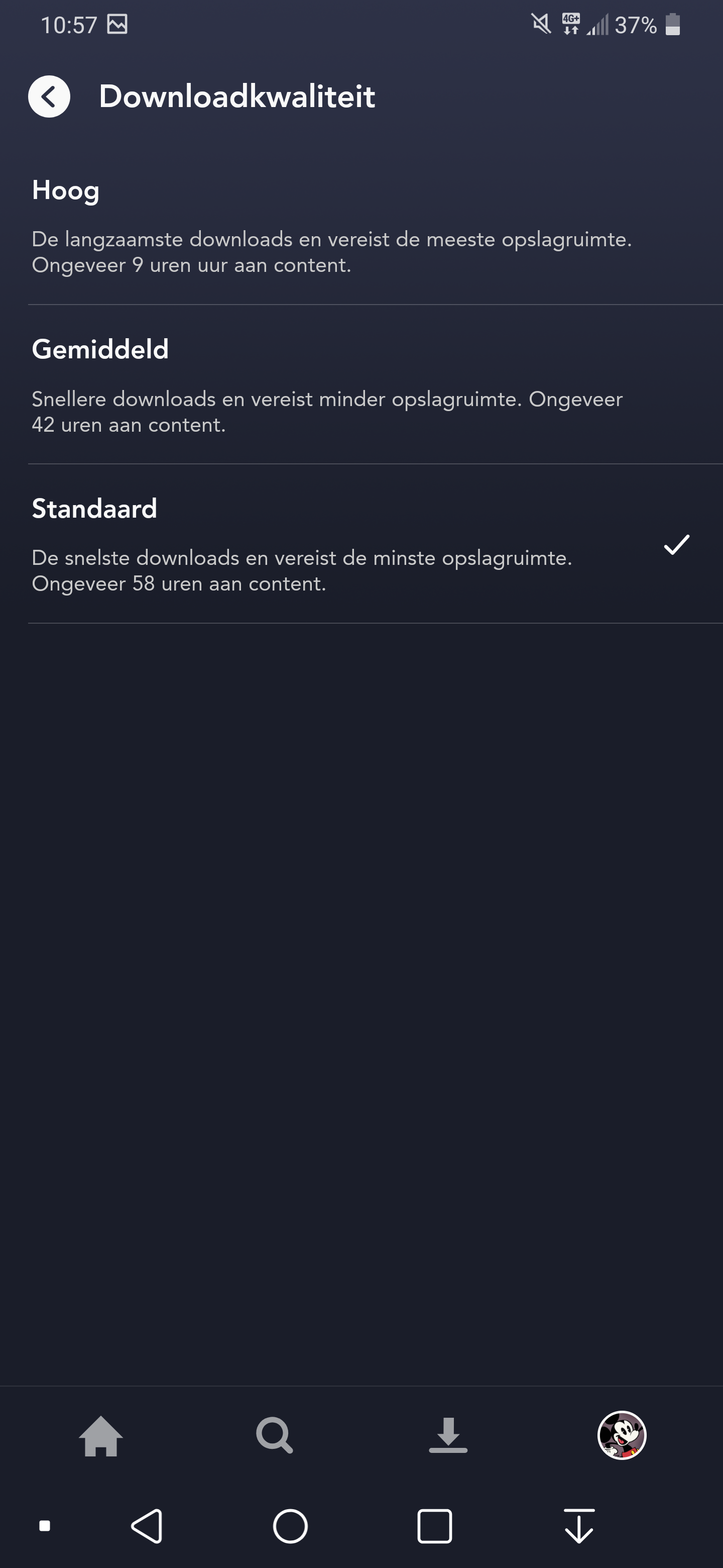 In de app-versie van Disney Plus kun je aangeven of je wel of niet via mobiel internet content wil bekijken (Profiel > App-instellingen). Zo ja, dan heb je ook de optie om films en series in lage kwaliteit te streamen, zodat je dataplan er niet helemaal aangaat. Een andere prettige optie is de mogelijkheid om films en series te downloaden. Dit is mogelijk in diverse downloadkwaliteiten: Standaard, Gemiddeld en Hoog. En opnieuw wordt er geen exacte resolutie vermeld.